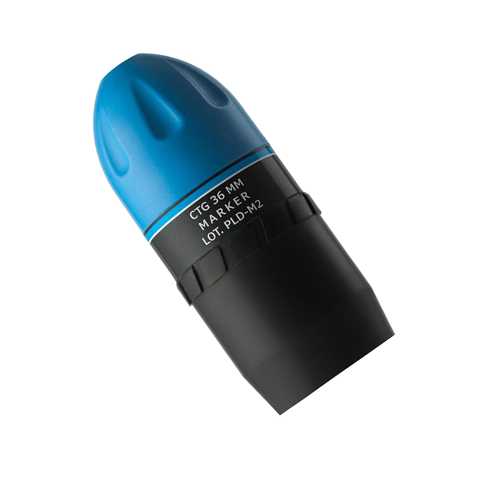 The non-pyrotechnic marking projectile “Paladin” is filled with non-toxic powder based on an easy to wash, food coloring components. At the moment when projectile strikes the obstacle, the thin shell cracks and the powder marks the surface.
